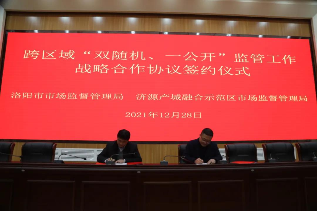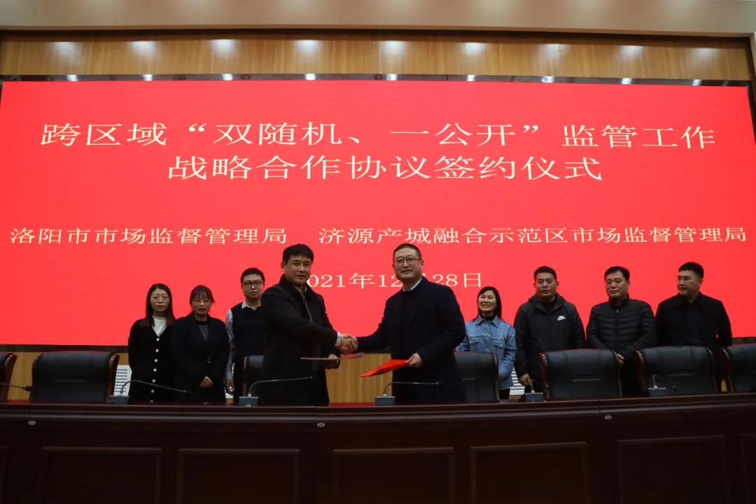 12月27日上午,洛阳市市场监管局、济源示范区市场监管局共同签署了跨区域“双随机、一公开”监管工作战略合作协议,正式开启了跨区域联合监管的创新之路,标志着洛阳、济源两地市场监管合作翻开了新篇章。
