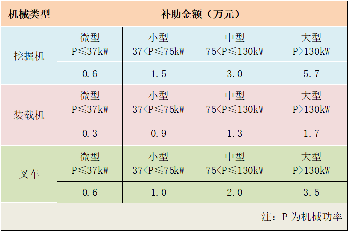 新能源购置补助。对购置同类型新能源机械的,按机械类型、功率等因素,按照标准给予一次性补助,具体金额如下表: