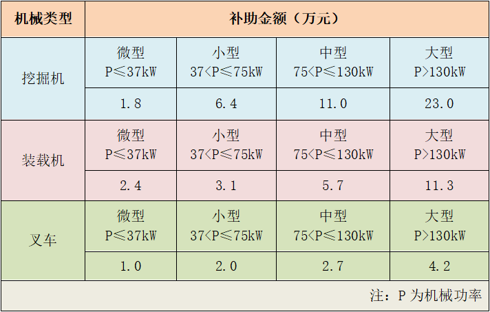 淘汰报废补助。对主动淘汰报废国二及以下非道路移动机械的,根据机械类型、功率等因素,按照标准给予一次性补助,具体金额如下表: