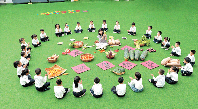 10月15日,济源市第一幼儿园,孩子们在操场开展“珍惜粮食”主题活动,倡导文明节俭新风尚。