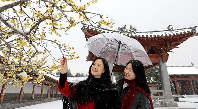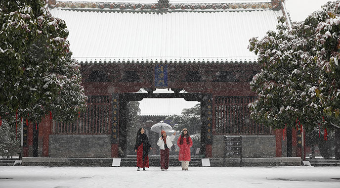 图① 市民在济水之源文化旅游区冒雪游览。