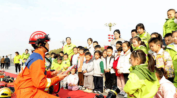 11月5日,在文化城西广场,消防救援人员为孩子们普及消防知识。