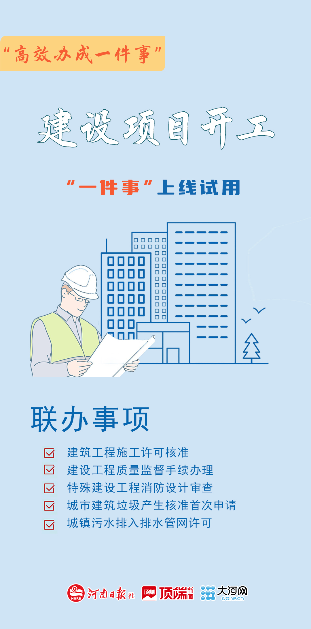 记者从省住房城乡建设厅了解到,河南省将工程建设项目开工涉及的建筑工程施工许可核准、建设工程质量监督手续办理、建设工程消防设计审查、城市建筑垃圾处置核准、城镇污水排入排水管网许可等5个单事项集成为建设项目开工“一件事”,开工审批从“分头办”“多次办”转向“一窗办”“一次办”,申请表单由4张整合为1张,办理环节由20个压缩为5个,审批时限从法定19个工作日压缩至5个工作日,企业跑动次数由4次减少至最多1次,有效节约了企业办事成本。