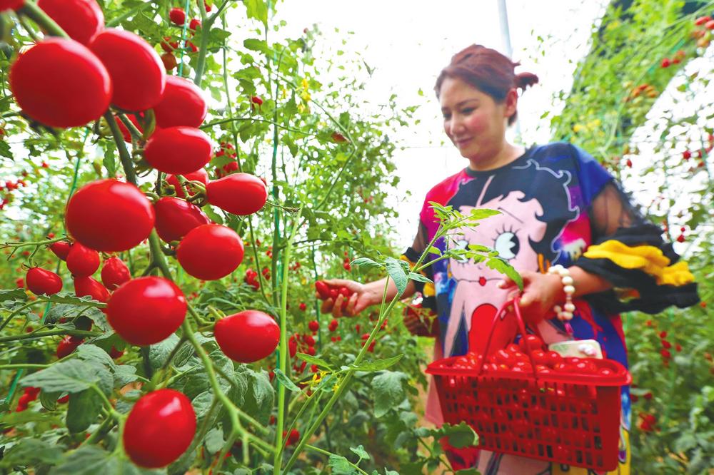 5月27日,在玉泉街道陆家岭居委会,市民正在采摘新鲜小番茄。 今年,该居委会以“村集体+合作社+农户”的农业社会化经营方式,打造10余亩番茄大棚,实现土地集约高效利用,促进农业增效、农民增收。