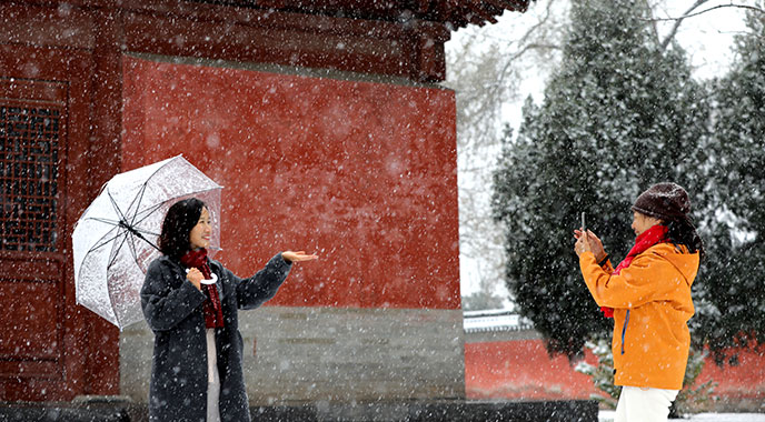 12月 12日,市民在河南省济源市济渎庙赏雪拍照。 新华社发(段二平 摄)